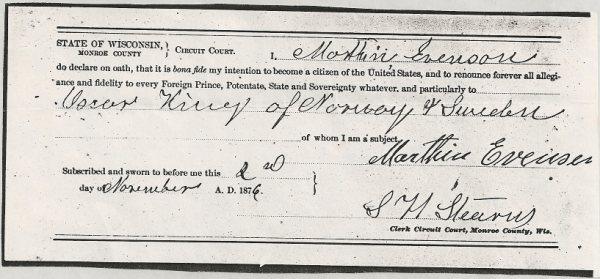 Exciting! Through the information provided in the census, Ms. Jeannie learned that Martin & Clara were from Ostre Toten Norway and Hurdal, Norway respectively. And Clara’s last name was Erickskillet. Martin applied for American citizenship in 1876 as determined by this document:
