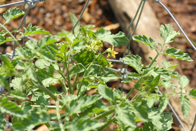 The vegetables and herbs don’t seem to mind that the fence is sort of quirky. They just keep growing anyway! Both tomato plants are already flowering!
