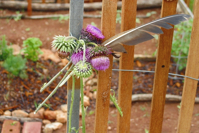 Ms. Jeannie clipped some wild thistle and hung it at the entrance for a little early color. Mr. Jeannie Ology found a buzzard feather that same day, so added to the bouquet it was!