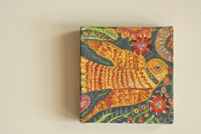 It just so happened that the first piece of folk art Ms. Jeannie ever bought was at the festival in 2008…a small 4×4 painting of a bird. Here’s a photo of it…