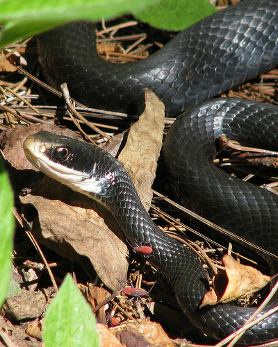Active during the day, racers got their name because they are fast movers. Similiar snakes are the black snake, the rat snake and the king snake, but the racer is the only one of these grouping who will actively (sometimes aggressively) try to get away from humans while the other snakes will just freeze in their tracks or slowly slink off.