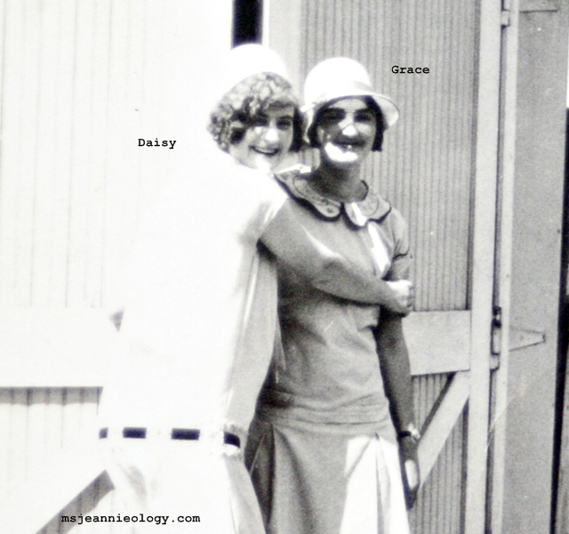 Well, we didn’t have any entrants, dear readers. Not one! But that is okay by Ms. Jeannie. This gives her another opportunity to exercise her imagination!  She had been looking at this photograph for quite awhile now, trying to imagine all the scenarios and possibilities these two ladies could have gotten themselves into.  For days and days she looked and thought, but she couldn’t get beyond a sentence or two. Not even with the handwritten prompt on back that read Grace and me. I have on Grace’s hat and she has mine on.