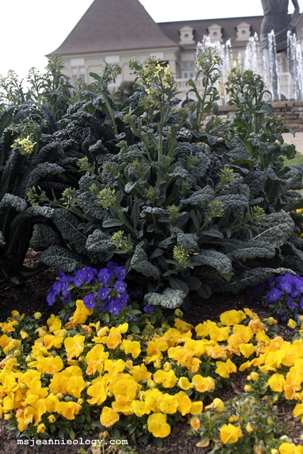 Since it was early Spring when Ms. Jeannie visited – the gardens and vineyards were just waking up – but to add a bit of color to the landscape, the flower beds surrounding the Chateau all contained a bright yellow/blue combination of pansies and guess what…  flowering broccoli!  Very pretty and quite an unexpected pairing! Ms. Jeannie will have to remember this for her early season gardening.