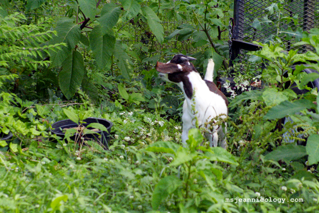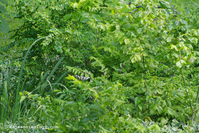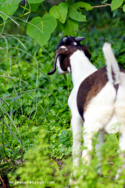 That’s Nyle, as you’ll recall from a previous post, the neighbor’s goat. The flora and fauna feast he’s enjoying are Ms. Jeannie’s scrub bushes in her side yard.