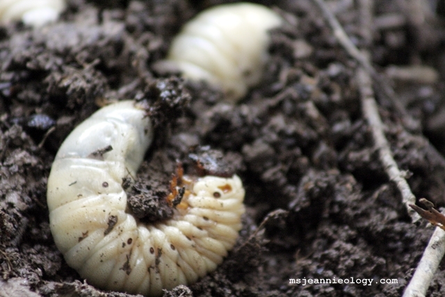 Ms. Jeannie thought at first glance that they were old porcelain doorknobs buried in the dirt, which would not be all that uncommon a find here in Ms. Jeannie’s area (more on dirt discoveries another day!). But in actuality, they are giant Eastern Hercules beetle larvae. And giant they definitely are! Each one of these guys here was about the size of a large shrimp. Eventually they will look like this…