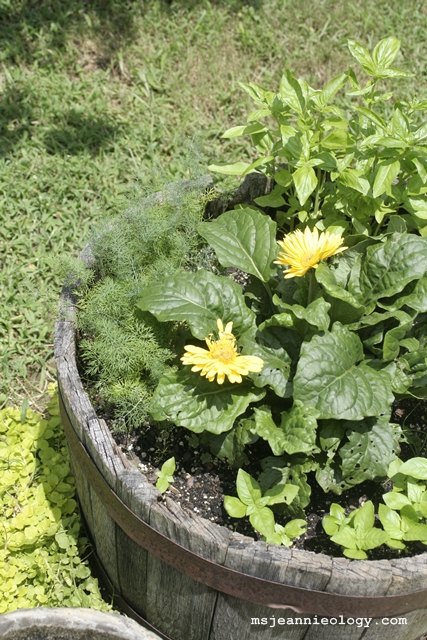 Pill bugs are also taking up residence at the base of Ms. Jeannie’s Gerber daisies which is also the same pot shared by her herb garden. At first glance – everything is growing right along – the dill is getting tall, the basil is filling out, the chives are fattening up and the daisies add a sunny bit of color.