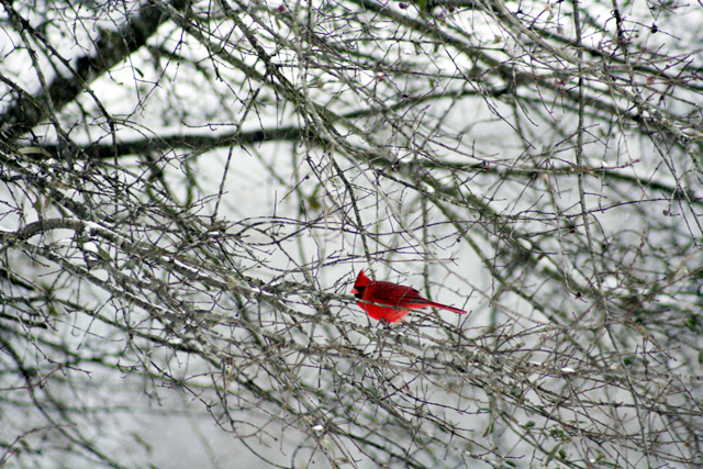 As the snow snow started to accumulate and the sky grew darker – the cardinals came for a visit and decorated one of the crepe myrtles just like it was a christmas trees and they were the ornaments.