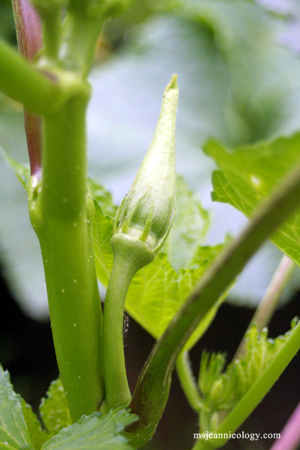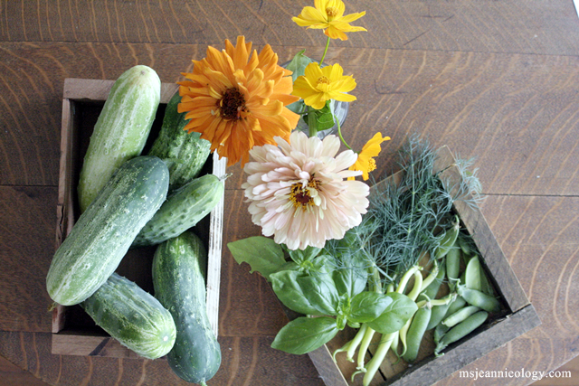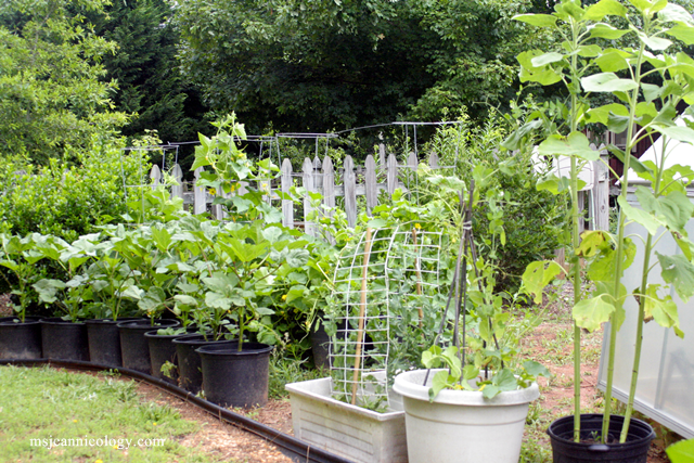 Ms. Jeannie picked six today, and as you can see there are what seems like a million in all stages still growing growing, growing. Ms. Jeannie could actually hear the cucumber plant say thank you as she plucked the ripe ones.  Baby cucumbers moved right into the empty spots. Productive little creatures:)