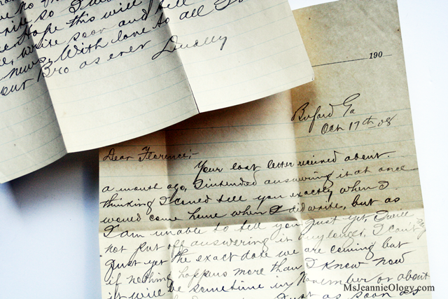 The correspondence is a typical brother/sister conversation… not much new here…sorry I haven’t written… the weather is fine…looking forward to coming home for a break…send my love to everyone…etc, etc, etc. But what struck Ms. Jeannie as most exceptional about this letter was not the contents, dear readers, but the date! Postmarked exactly 106 years ago today – October 19th, 1908! Imagine that! That’s Dudley’s message to Ms. Jeannie – to take time for a break so that you can see the details in life instead of just pushing past with productivity.