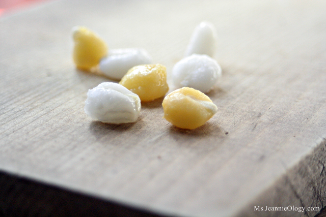 Hominy comes in two varieties – white and yellow. And as you can see from this picture – when compared to a popcorn kernel it is quite plump. The recipe calls for both colors which gives it an attractive color palette.