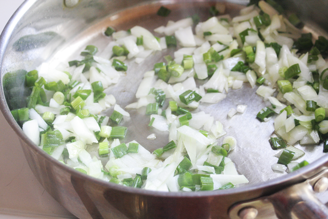 Heat the oil in a large pan. When it is hot, saute the onions and scallions for one minute. Then add zucchini, mushrooms, garlic, cumin and pepper flakes: cook for 3-4 minutes.