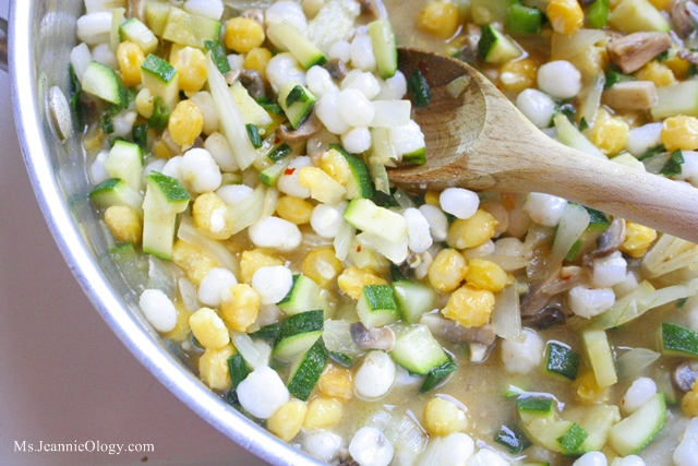 Add the hominy (with liquid from can) to the pan and bring mixture to a full boil. Reduce heat to low, cover and simmer for 10 minutes. Check the consistency after 10 – you don’t want it to be soupy, nor do you want it to be dry. If it is too liquidy – let it simmer until mixture is just moist. If it is too dry add a few tablespoons of water.