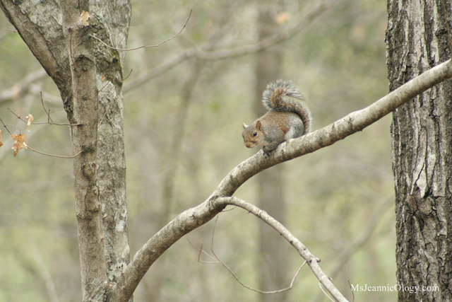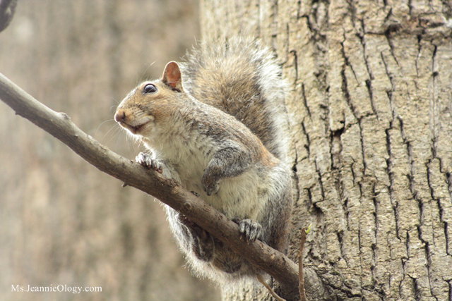 Spring has got to be the best time of year to be a squirrel. The weather is warm. The ground is soft. All the trees are in bloom. Ms. Jeannie was thinking about this the other day on her walk when she was joined by this guy chattering in the trees…
