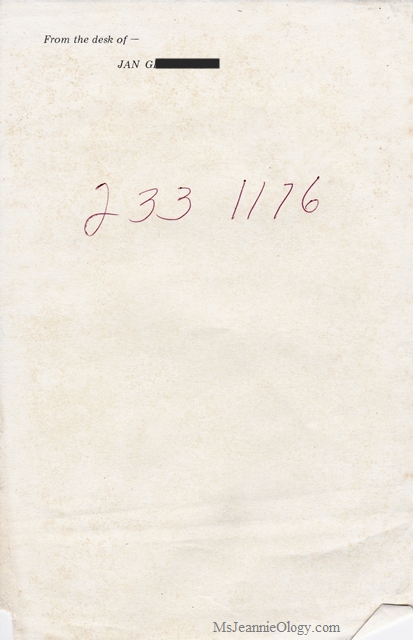 Today’s picture post is all about the pieces of paper ephemera that Ms. Jeannie has found in vintage books over the past few years. Each tells their own story about past readers, past events and past importance. They range from the commonplace (names, numbers and business cards) to the intimate (photographs, holiday cards, a letter to family that mentions Hitler and the war in Europe); from the topical (advertisements, recipes, lists) to the nostalgic (a letter detailing what to pack for camp) and from the unusual (a receipt from a cat breeder) to the campy (travel postcards). All these pieces of paper came from books published before 1970 but they cover a wide time span of the last century. The oldest is a scrap of paper dating to the late 1800’s and the most current is a handwritten recipe from 1980. Because they offer glimpses into past lives, Ms. Jeannie has blocked out any personal info that might still be traceable today so you’ll notice a few have some blocked out parts, but other than that they are unaltered. Let’s look..