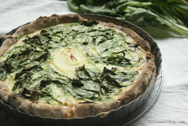 There was only one slight problem with all this. After discovering the recipe, Ms. Jeannie had just returned from market with a basketful of two other shooting stars of the spring season – sweet onions and spinach and sadly, no asparagus. So she improvised, playing a little game of surprise with Mrs. Patmore. By switching out some ingredients for others but retaining the same tart crust and the same measurements of additional ingredients, Ms. Jeannie made a similar tart that would have served all party-goers just as well during the season. This is what she made…