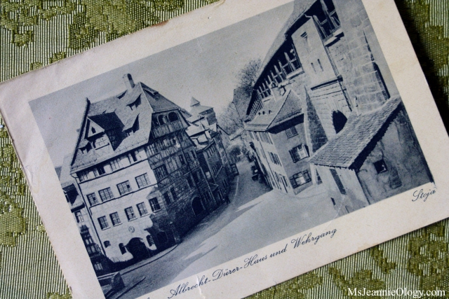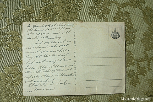 It was a 1930’s paper postcard from Nurnberg, Germany.  While the card was never mailed there was a detailed message hand-written in fountain pen ink on the back. It read…