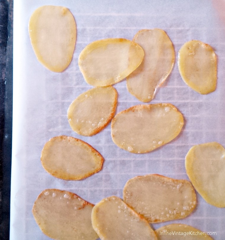 In a medium saute pan heat one teaspoon butter over medium heat and saute the potatoes (turning regularly with a fork so they don’t burn) until tender but not browned (about 2-3 minutes). Note: You’ll see as you are cooking the potatoes that they will go from white to translucent. When you can see your fork tines underneath the potato slice that is when you know they are ready to be removed from the heat. Place cooked potatoes on a sheet of parchment paper to cool.