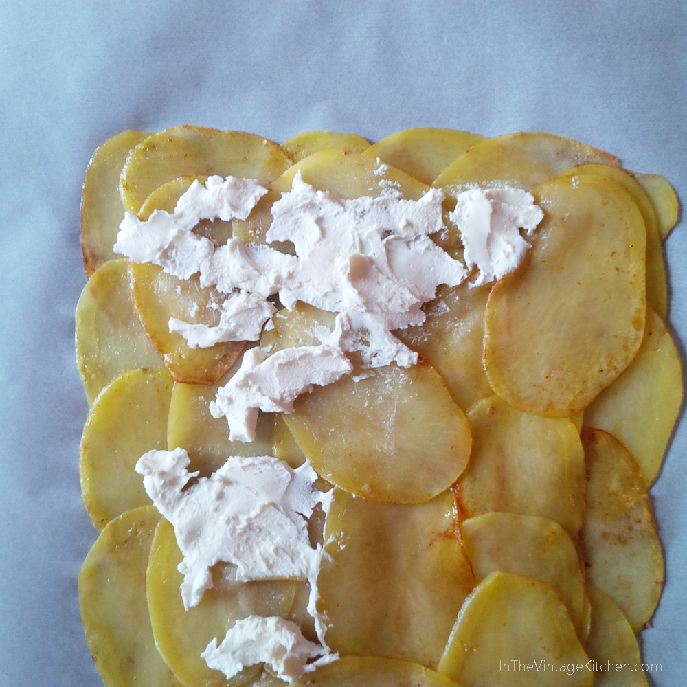 Next add the goat cheese on top of the potatoes – spreading it in a layer all over the potatoes. Note: this is much easier if your goat cheese is also at room temperature. A frosting knife works well for this task or your fingers!