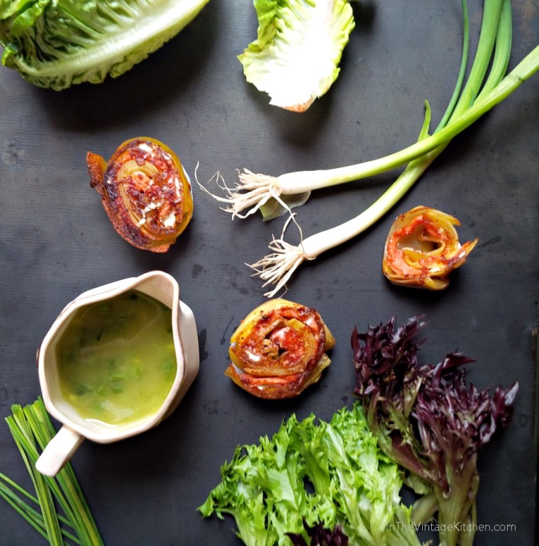 Capitalizing on all things seasonal, this recipe is great for this time of year because it features chives, spring lettuce and scallions all which are now in season at the farmers market. A little note about prep time: while this recipe is fairly easy to make and contains basic easy-to-find ingredients, the roulade requires seven hours of refrigeration time before cooking so you may want to get this recipe ready in the morning if you want to plan on having it for dinner. That being said, the finished dish is well worth the wait and all that extra fridge time.