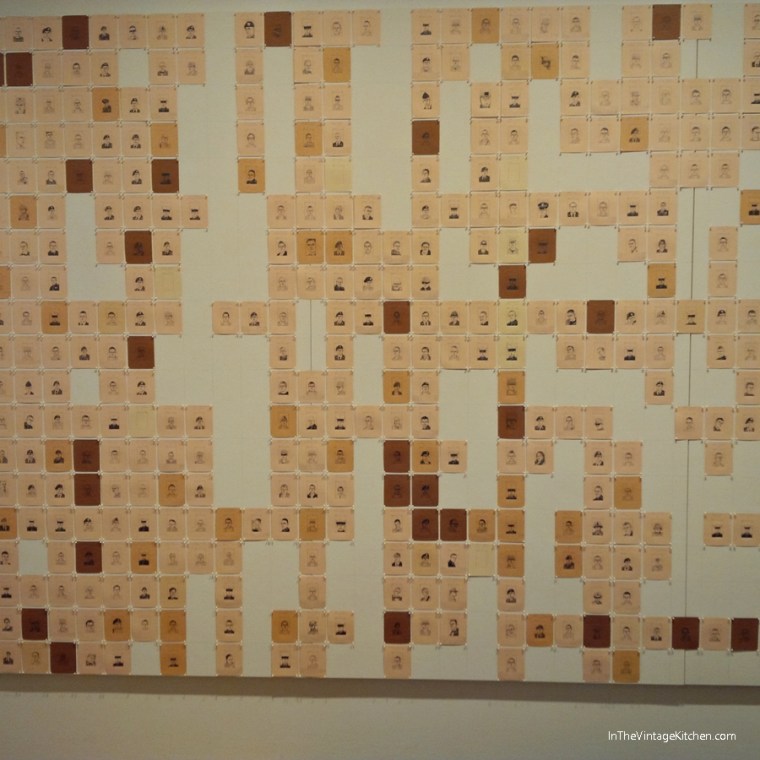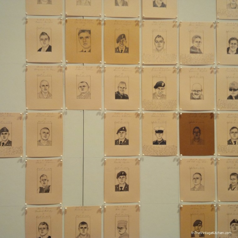 Just like my time spent with Ben, I was equally captivated by an exhibit called The Face of Battle: Americans at War from 9/11 to Now which featured intimate glimpses into soldier’s lives… black and white leisure portraits taken in camp, paintings of wounded soldiers in full uniform, photographs of deceased soldiers home-based bedrooms, a creative video piece of a casket returning stateside. As you can imagine it was really moving and very sad. One of the exhibits inside the exhibit was a 5,000+ piece collection of small wallet sized pencil drawings of American servicemen and women who have died in Iraq and Afghanistan. This installation was completely hand-drawn by the American artist, Emily Prince. It took up three walls of one gallery and from a distance looked like a big Scrabble board. This is a snippet of one wall…