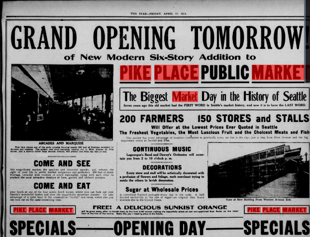 Pike Place Market first opened in 1907 and quickly became a cross-cultural beehive of people and products offering everything from fresh fish to flowers, art to textiles and practically everything inbetween. You can feel the excitement in this 1914 ad from the Seattle Star as the market gained momentum…