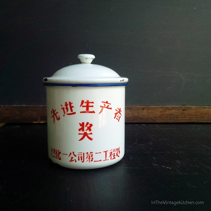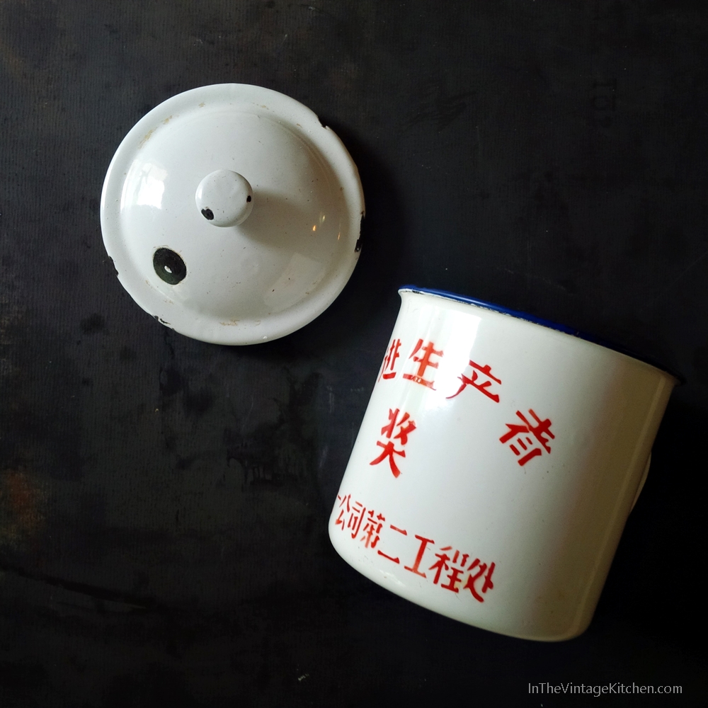 In April, we posed the question…how many people does it take to translate a mug? We were up to four at that point with two more possibilities waiting in the wings of email communication. The mug in question was a vintage 1950s enamelware-covered cup made by the Peacock Enamelware Factory in Tianjin, China.