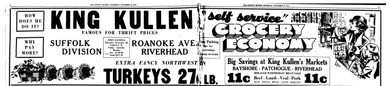 And then there was the significant pricing system. Upon opening, King Kullen boasted that they could reduce your average grocery bill by 10-50% which during the Great Depression years was a major attraction for struggling wage-earners. By offering everything from house paint to ham (the “super” market concept) under one roof, King Kullen became a one-stop shop. You can see the price difference between Kroger in the 1920’s and King Kullen in the 1930’s in these advertisements…