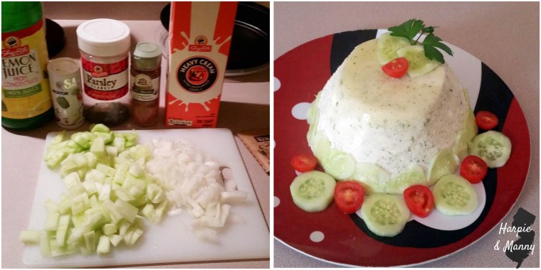 Note how Harpie & Manny’s cucumber mousse has a lovely even consistency throughout. Our mousse in the Vintage Kitchen, had a two-toned effect with a bright green gelatin ring at the top. Not sure, why this happened but it did give our mousse an extra dose of wiggle.