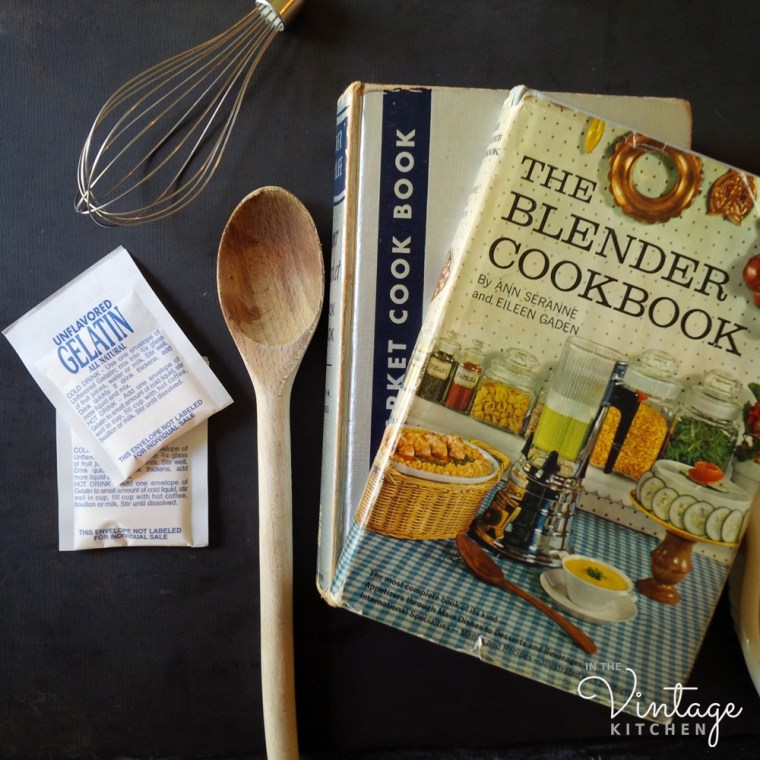 Today in the Vintage Kitchen we are talking about gelatin. That powdered concoction of collagen that originated in the boiled hooves of calves back in the 1700’s and now can be found in slim paper envelopes, dry and granular, in grocery stores around the world.
