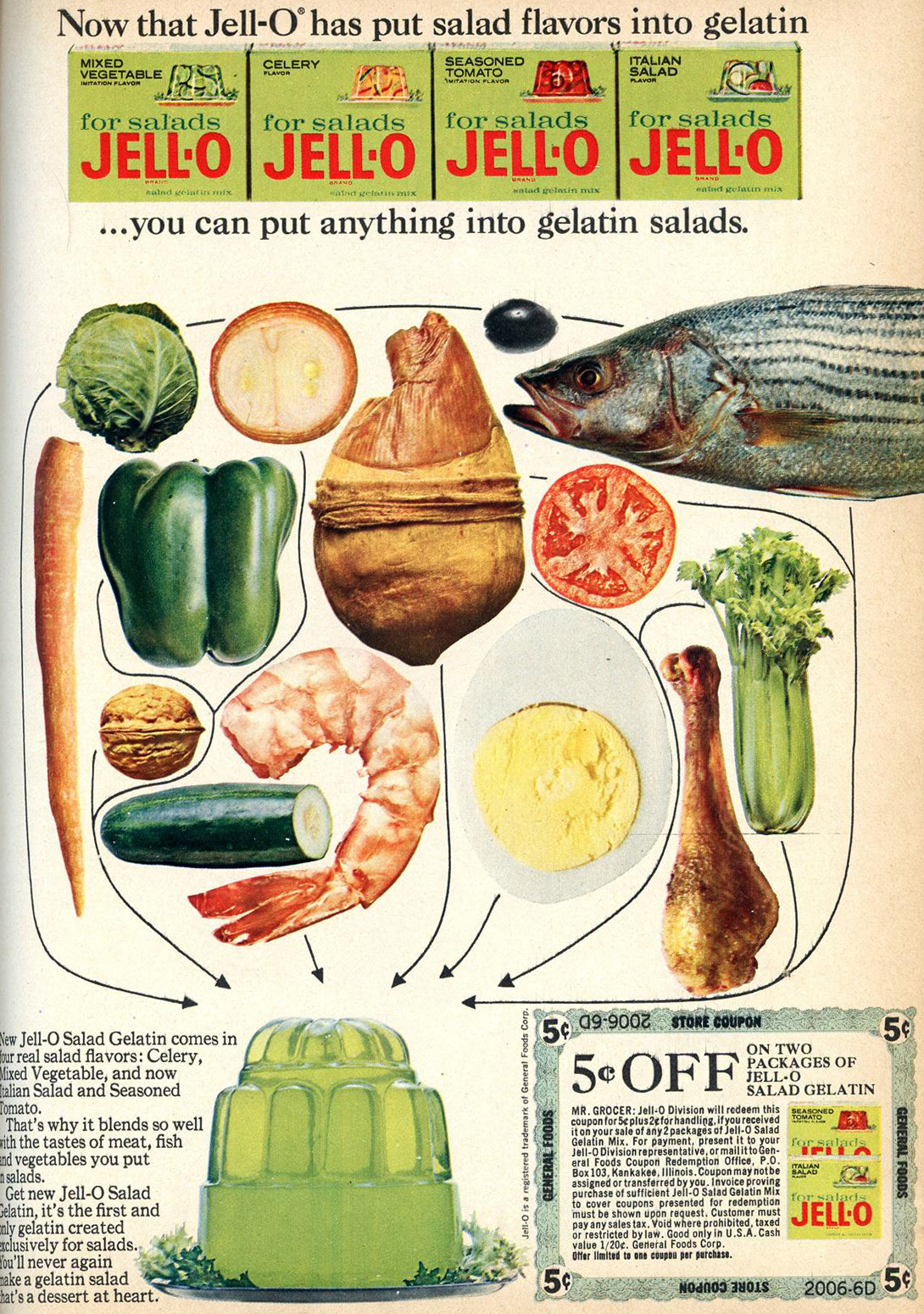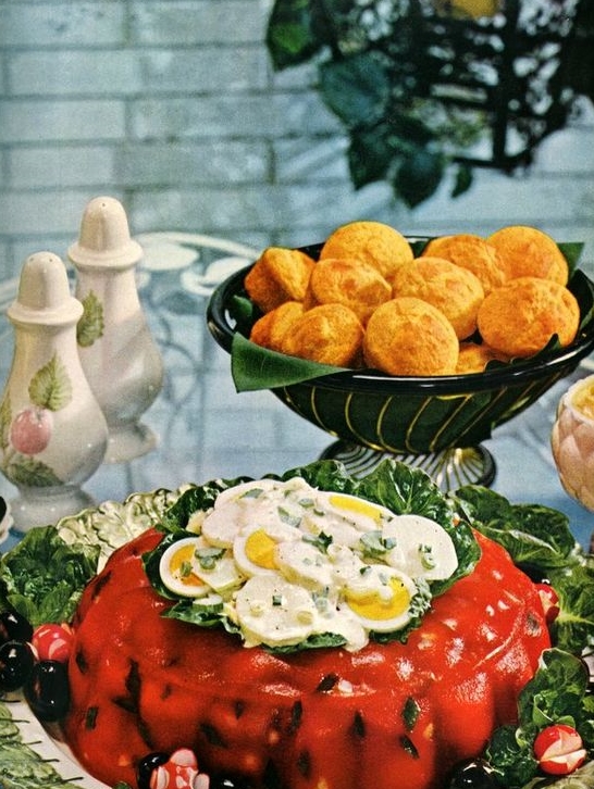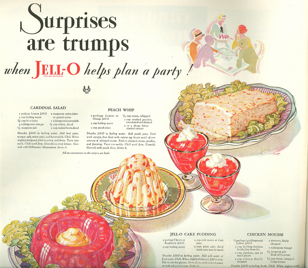 Food suspended in a translucent, quivery clump doesn’t necessarily sound or look appealing to our modern selves but there was a time in history when this type of dish was considered the essence of elegance. For centuries, gelatin has been used in cooking but in the 1930’s aspics, mousses and molded gelatin salads began to rise in mass popularity among both the upper class and the lower class for two entirely different reasons. Affluent, upper-class society enjoyed such dishes for their delicate and artistic composition while lower working classes, struggling to get through the Great Depression, valued gelatin as an inexpensive source of protein that came with an added bonus of being able to disguise and transform leftovers.