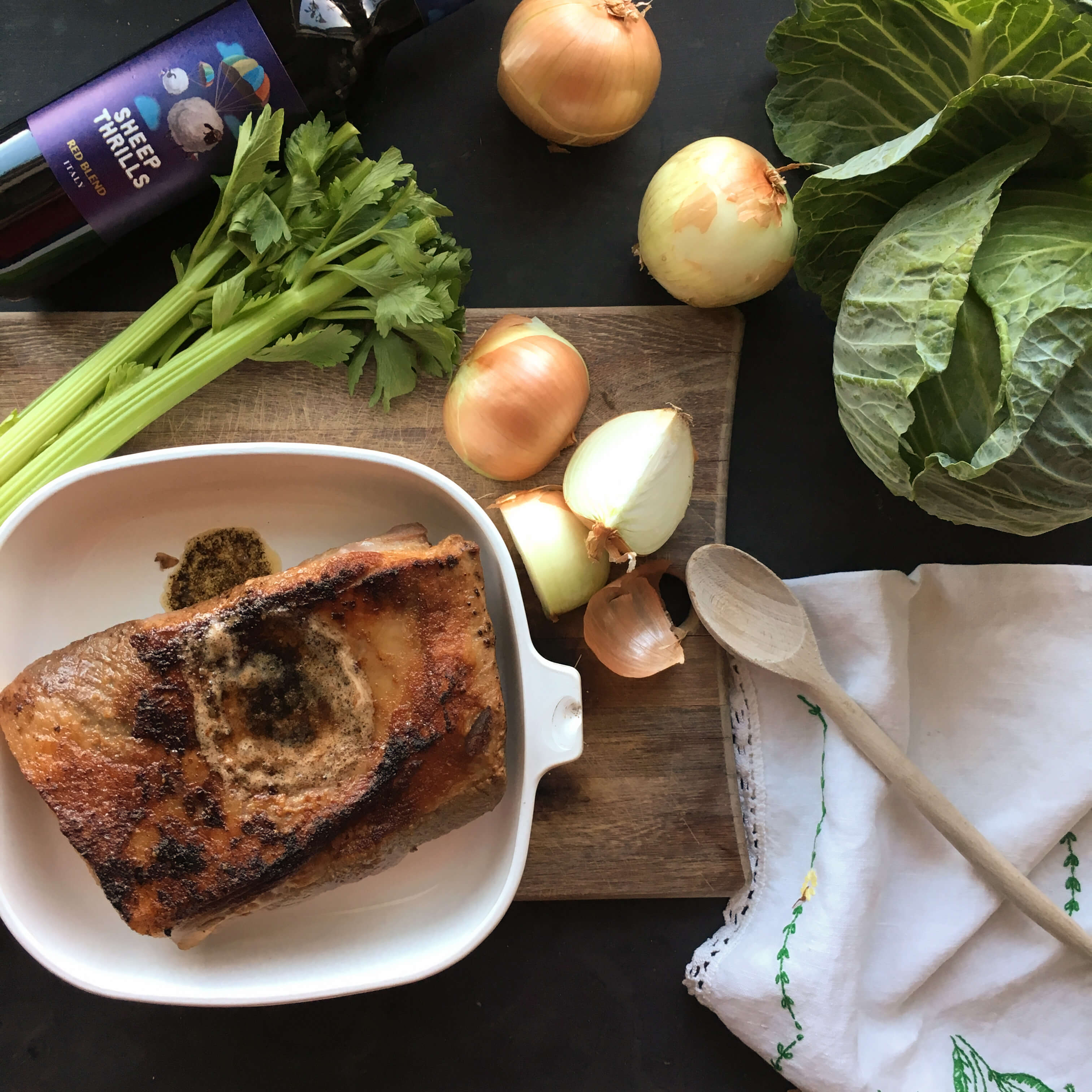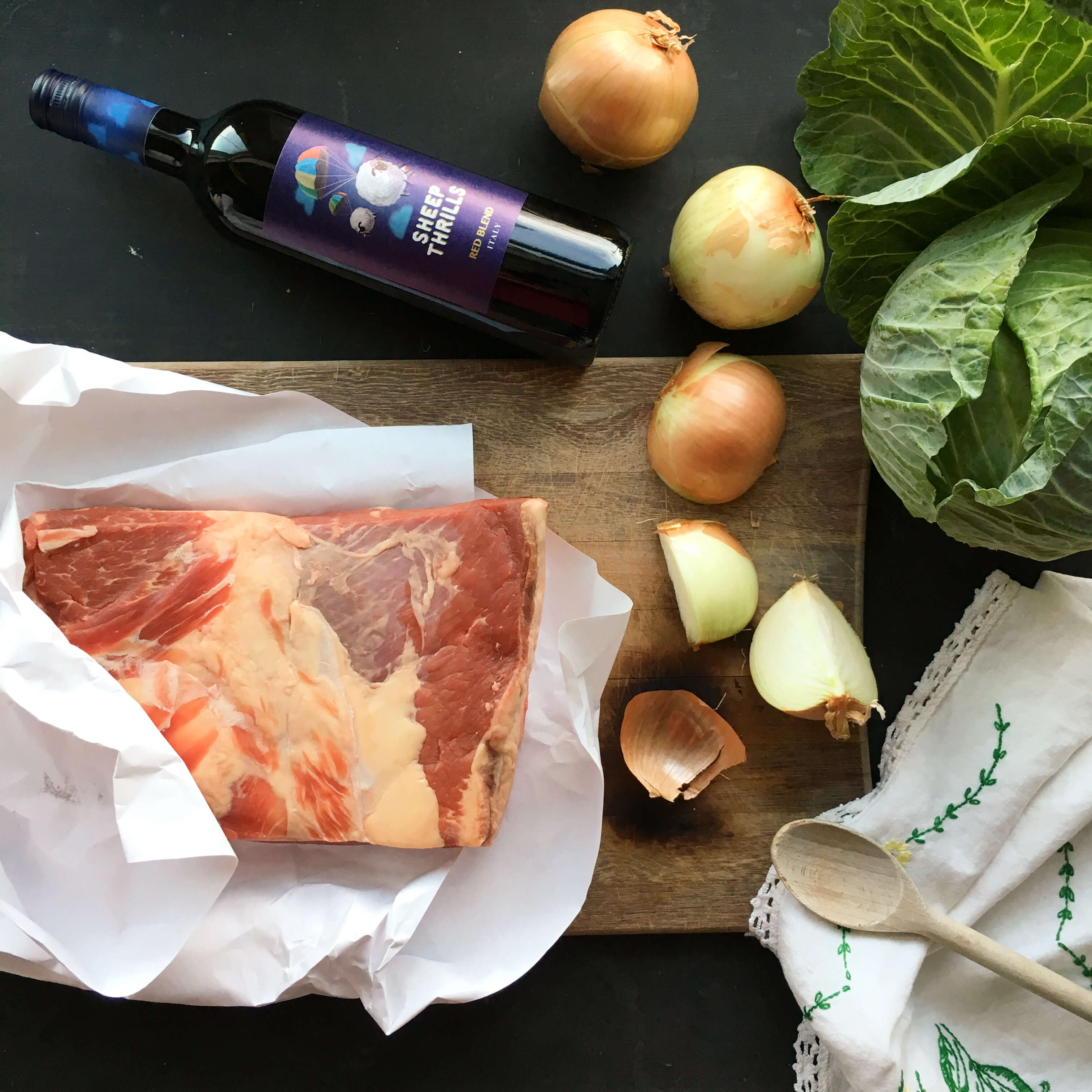 Although it requires two days to make, it is very simple and involves just a few ingredients. I used grass-fed beef from the farmers market and a red wine blend called Sheep Thrills for the fun pun. Also, Annie cooks like James Beard recommends – with your intuition – so she doesn’t specify in her recipe exactly how much seasoning to use. In the directions, I share my method, but you may want to add more or less depending on your preference.
