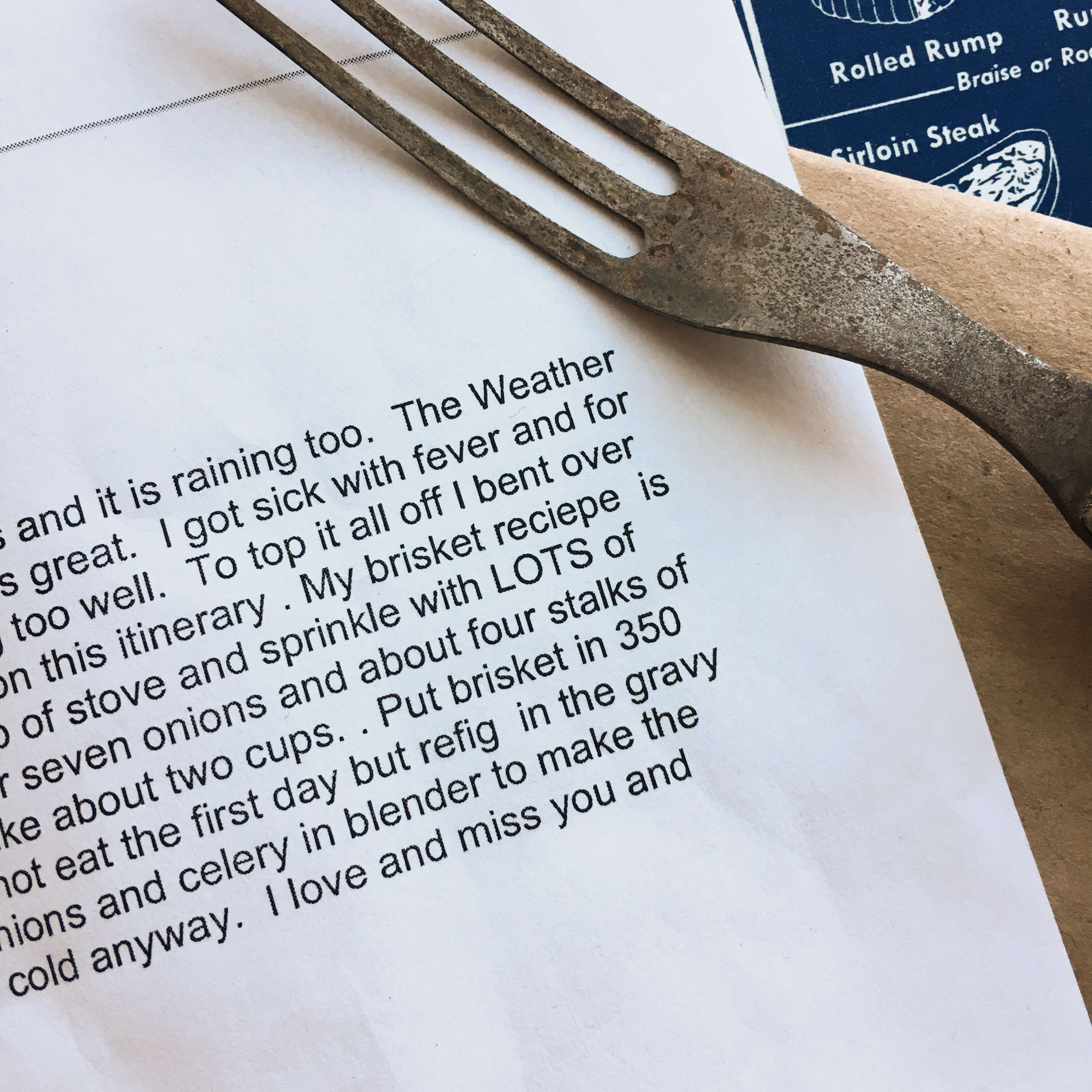 Annie sent this recipe to my dad over email 15 years ago while she was at sea traveling between Buenos Aires and Santiago. The trip was rough with wild waves and cold temperatures but Annie was more than happy to take a few moments to share her way of making brisket. In our modern age, email letters aren’t quite as pretty as handwritten ones – but the sentiment is there nonetheless. My dad has hung onto her correspondence for over a decade and a half. I discovered it recently, tucked inside one of his favorite cookbooks.