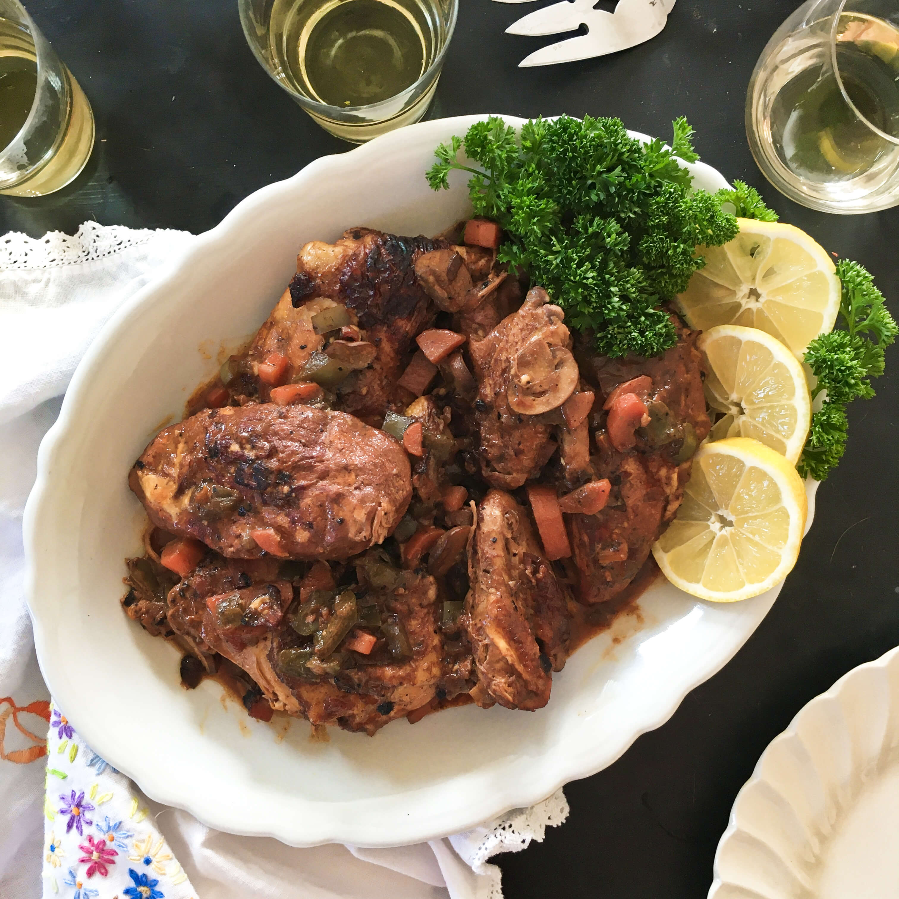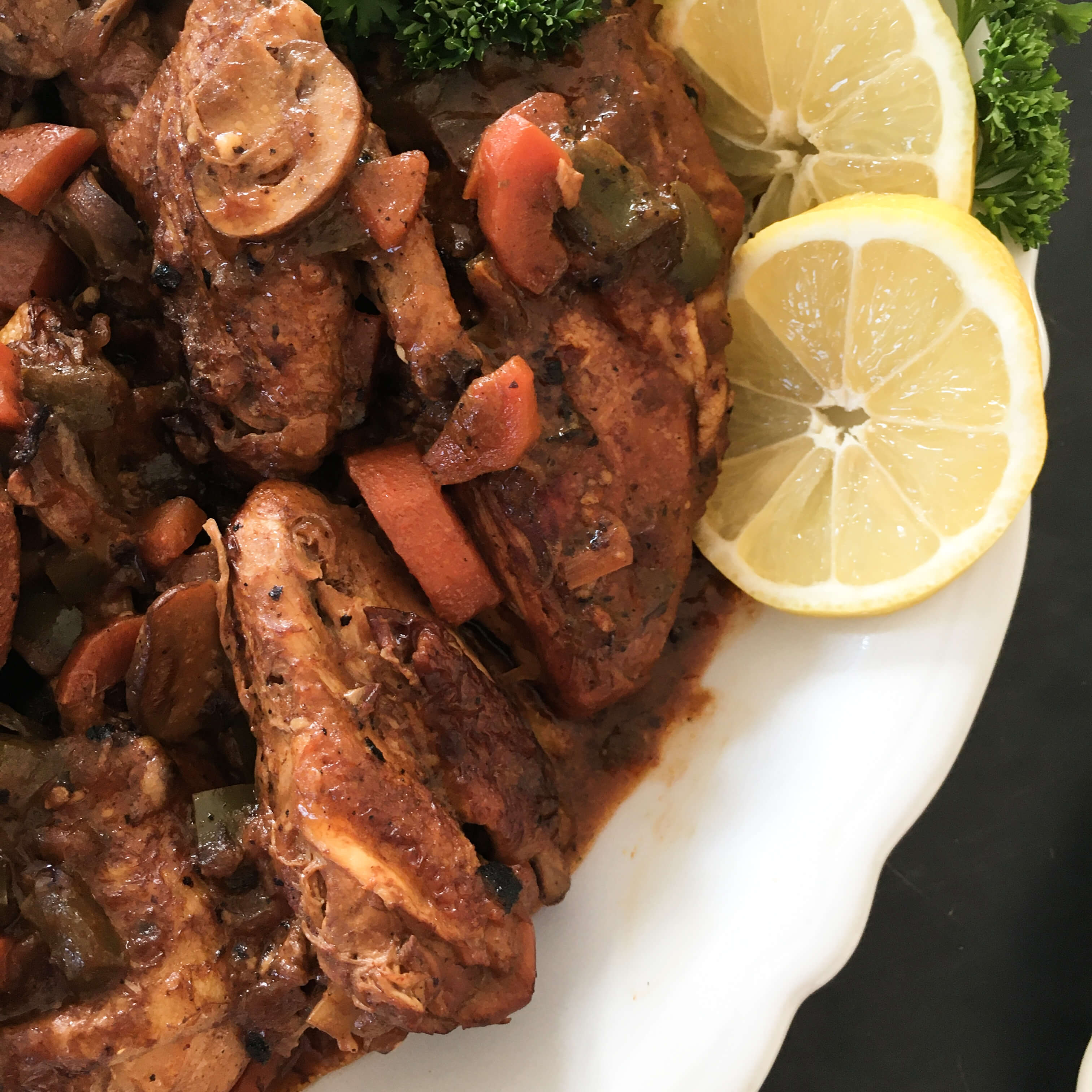 At this stage, taste the sauce and determine whether you want to add an additional 1/2 teaspoon salt and the lemon juice. Once seasoned to your preference, transfer the chicken to a warm platter, and spoon the sauce over the top. Garnish the dish with lemon slices and fresh parsley and serve.