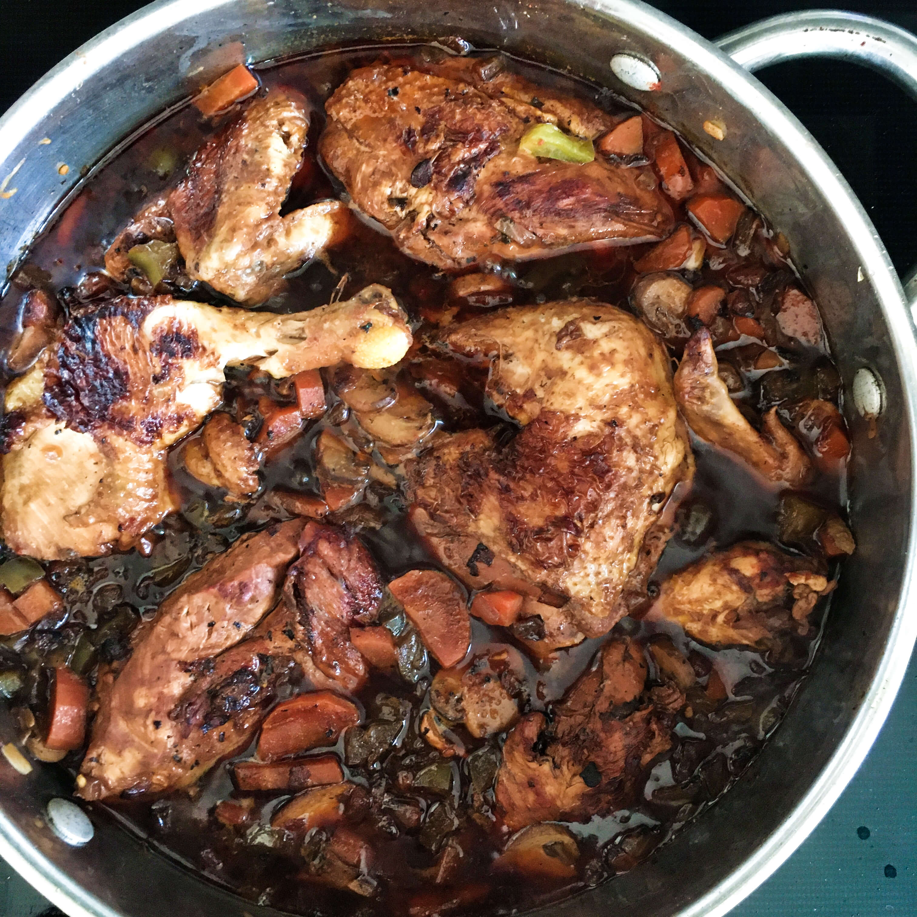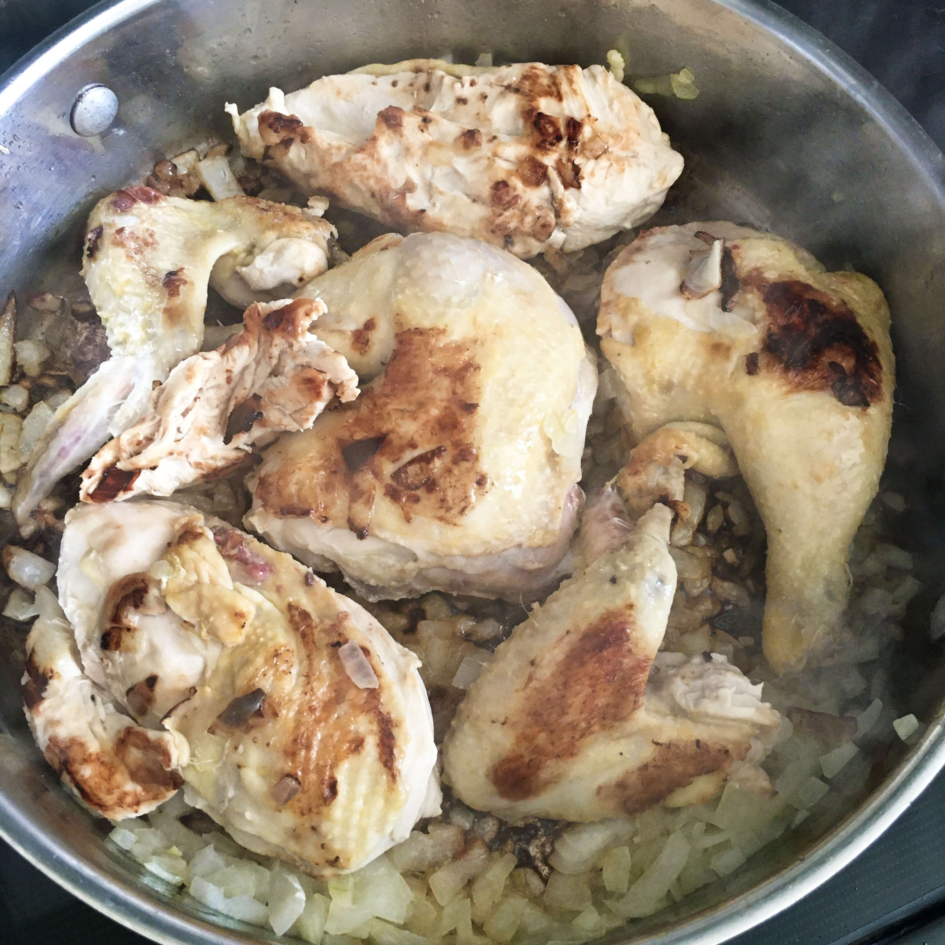Melt the butter in a large heavy saucepan. Add the onion and saute until tender but not browned. Add the chicken pieces and brown on all sides.