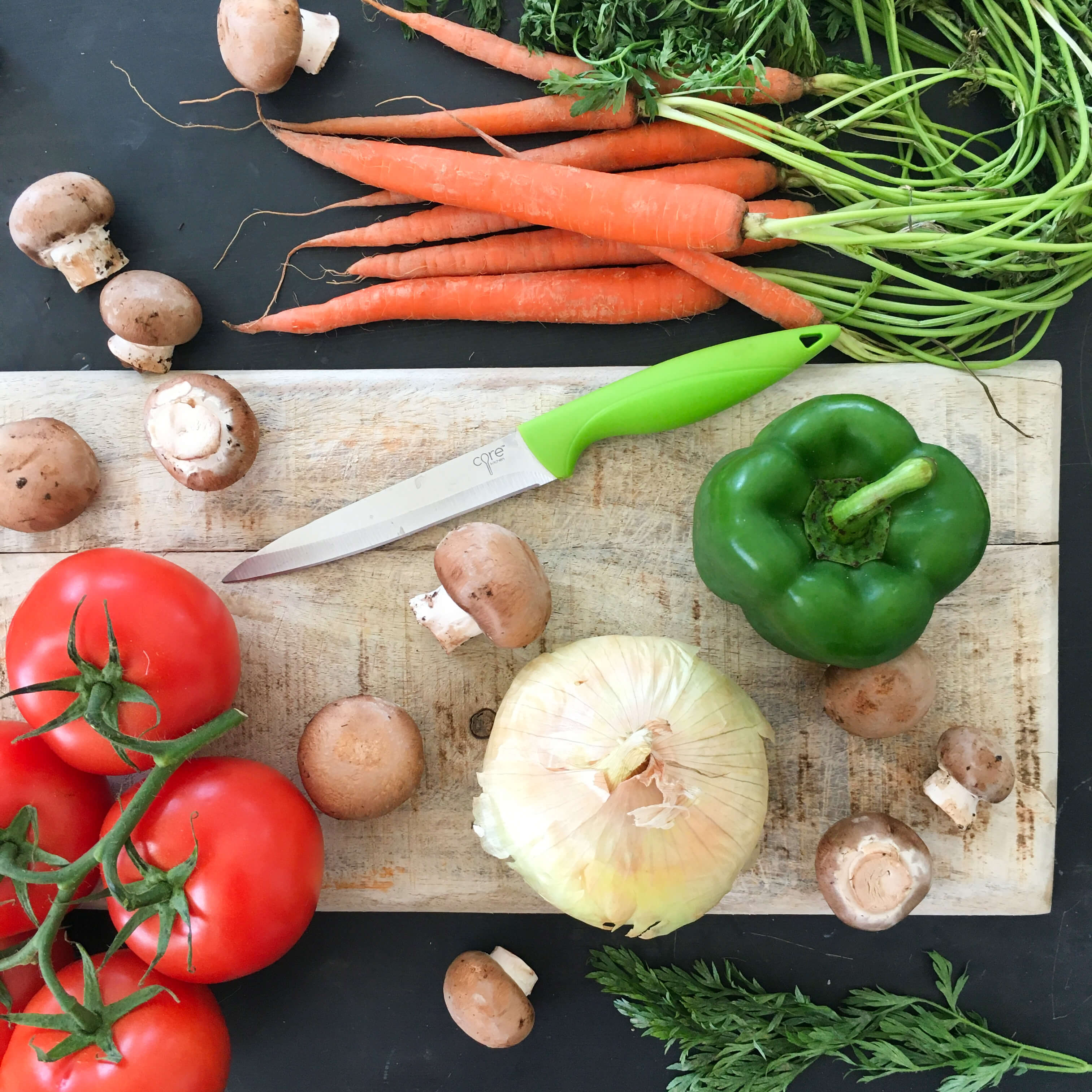 Add the green pepper, carrots, mushrooms, tomato, stock, paprika, 1/2 teaspoon salt and pepper.