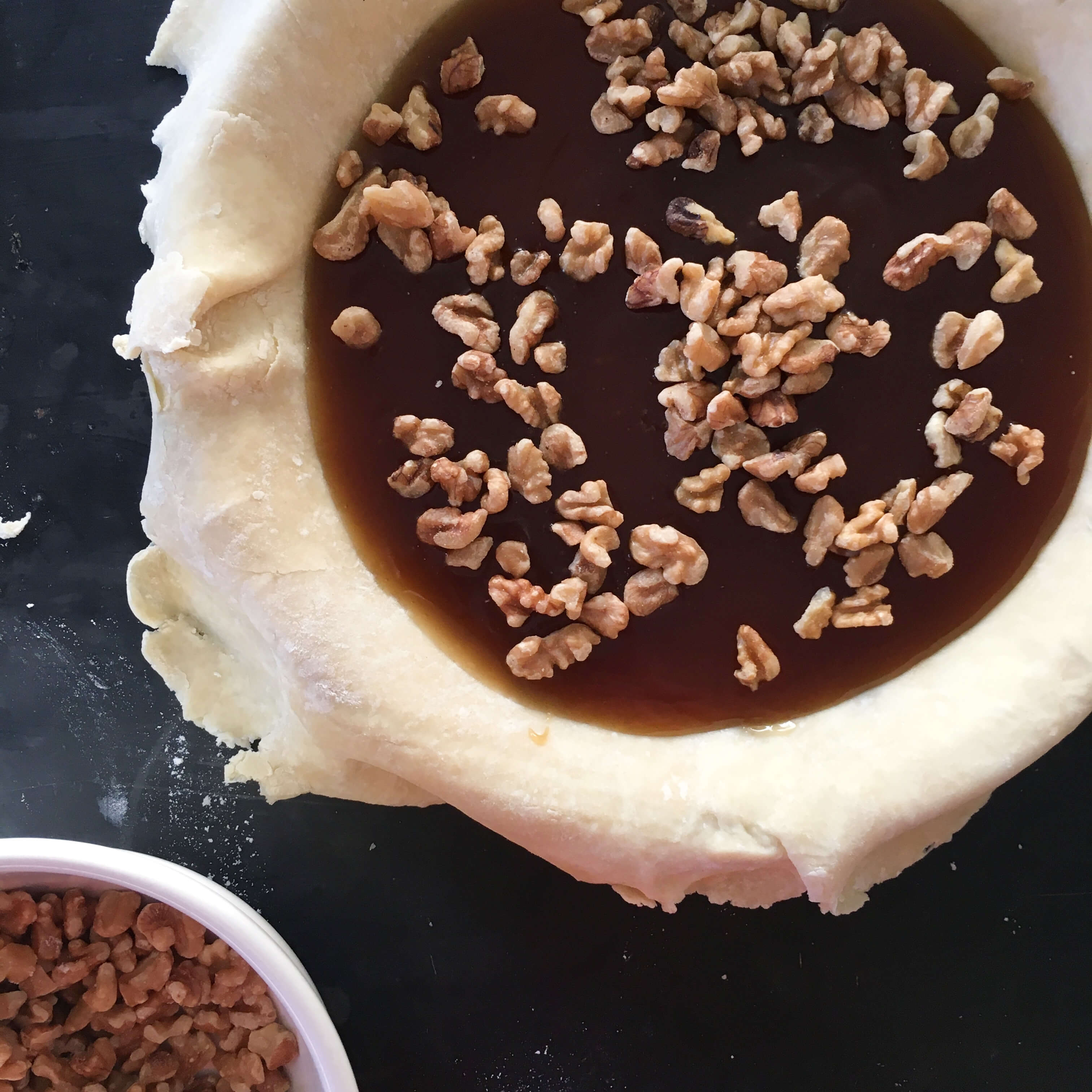 Line an 8″ inch pie pan with the pastry, pour in the cooled syrup and sprinkle the walnuts on top.