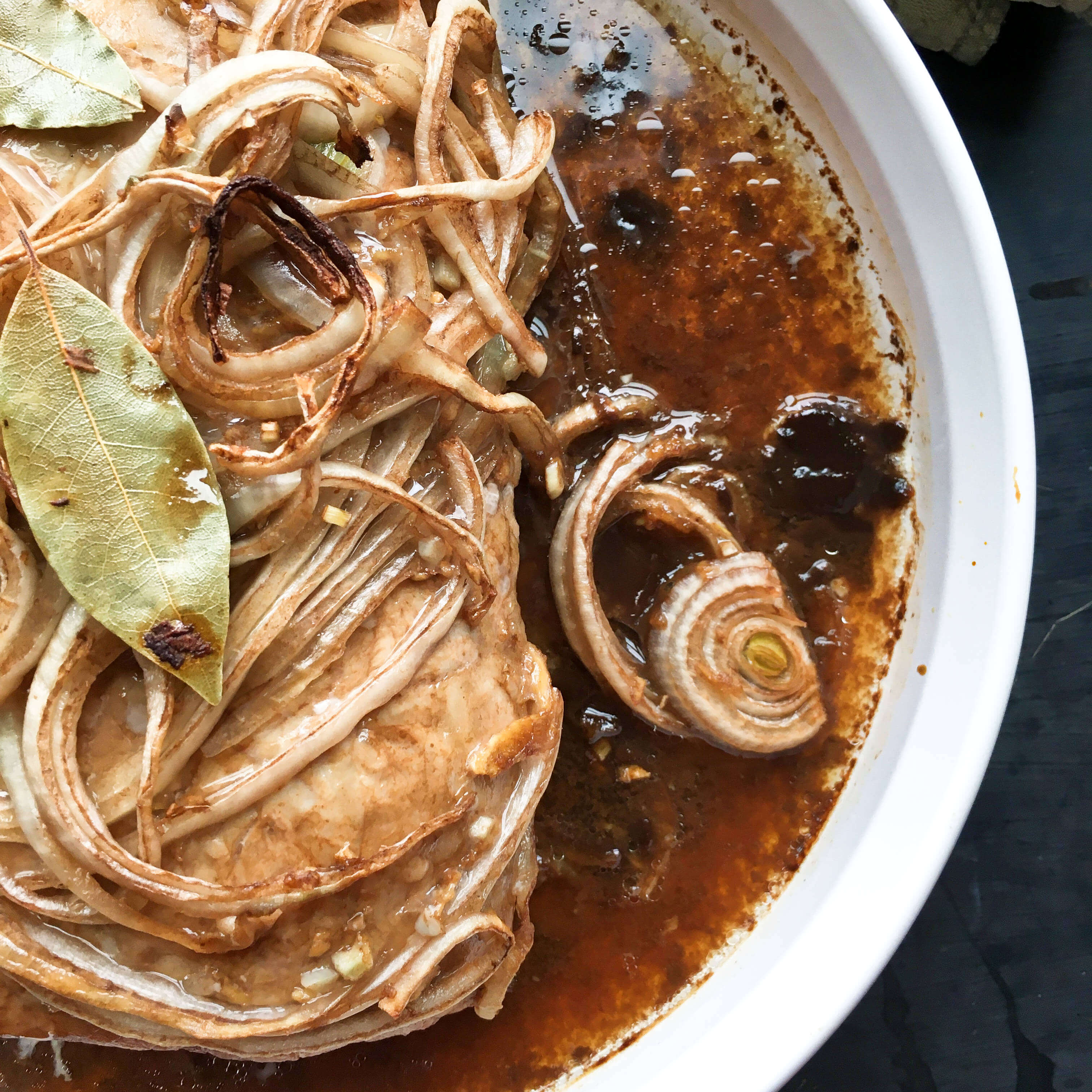 Filled with flavor notes of lime, ginger and garlic, this roast turned out to be wonderfully delicious. The caramelized sugar adds a bit of sweetness to the roasting juices, which makes its own rich sauce for drizzling. The onions, had an unexpected crunch to them and a sweet tangy taste that reminded me a little of pickled vegetables.
