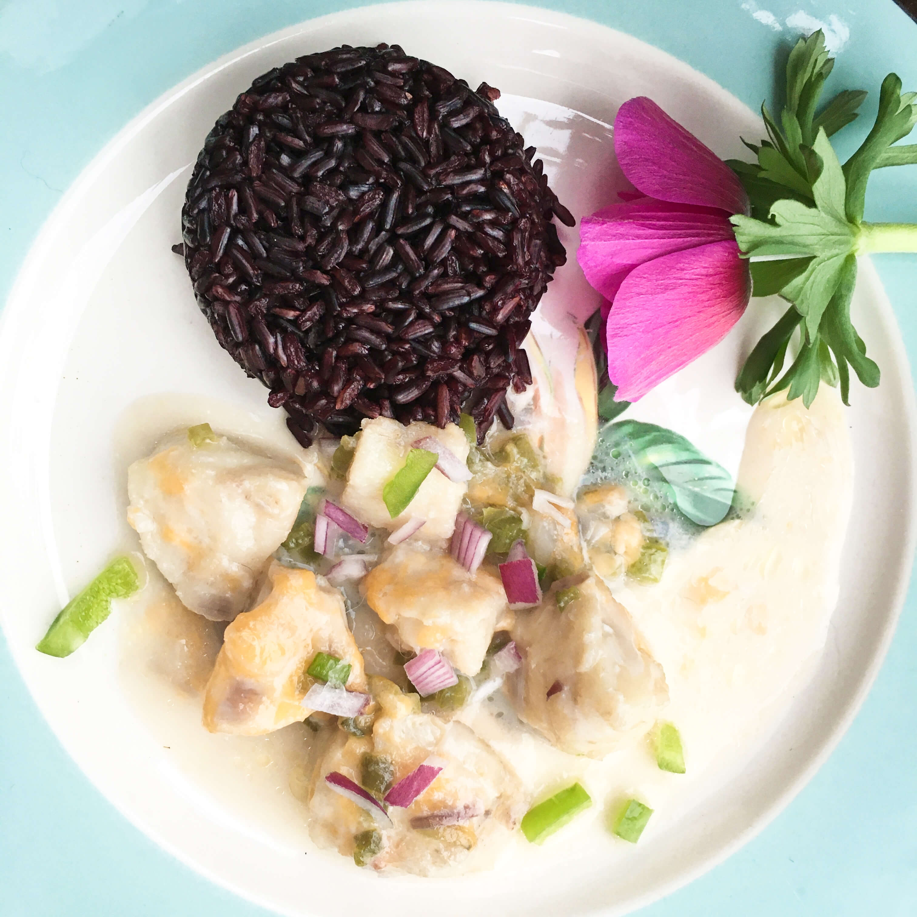 Because of Fiji’s geographic location, its local cuisine has been influenced by India, the Polynesian Islands, Asia and most importantly by what grows naturally well on the islands. Coconut, sweet potatoes, root vegetables and seafood are common staples. Since there were no serving suggestions when it came to this recipe, I paired this creamy fish with black rice for both its dynamic color and its fragrant, slightly nutty taste. This turned out to be an ideal companion as the flavors blended together really well and the rice soaked up some of the sauce. A little sprinkle of freshly chopped purple onion and green pepper on top of the fish added a splash of color for garnish.