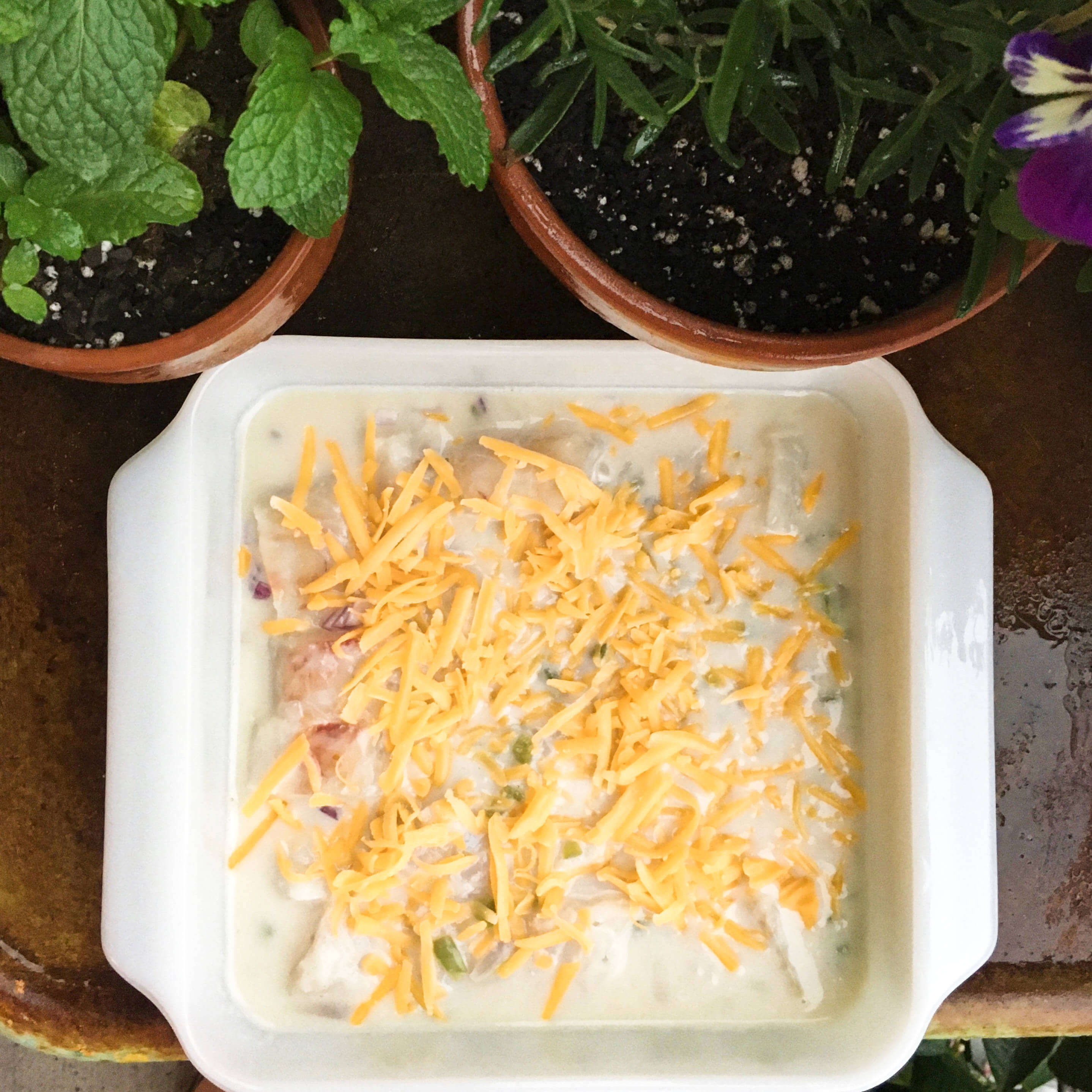 It was one of those storms that comes on quickly, toting dark grey clouds the size of whales and sucks up so much natural light, you have to turn on every single lamp in the room just so you can see what you are doing right in front of you. Rolling in just a few minutes into the cooking process, right as I began sauteing onions in a pan for the cream sauce, this storm turned the kitchen so dark and moody, the photo/video shoot had to immediately go on location (aka the balcony) so that I could grab as much natural light as possible. Otherwise the whole cooking process would have resulted in murky colors and grainy details. Fortunately for this purpose, there’s a small nook on the balcony between two potted herbs and some blooming flowers that is impervious to damp weather. It’s the one little dry spot that can accommodate an impromptu photoshoot without ruin to camera or food subjects.