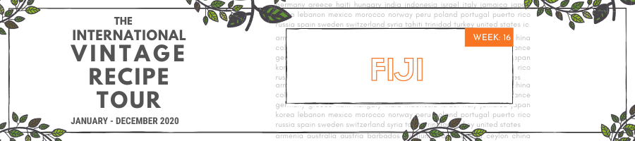 Tonight’s post takes us to the beautiful islands of Fiji, via the kitchen, to make a very quick, very easy fish dish that tastes of coconuts and day dreams and relaxed coastal living. Welcome to Week 16 of the International Vintage Recipe Tour. Welcome to Fiji, dear kitcheners!