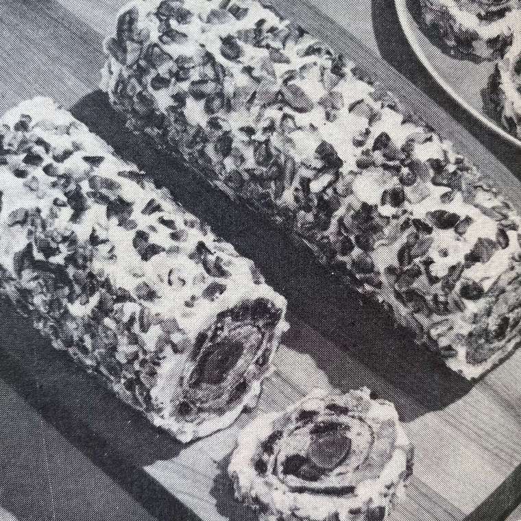 Slice ‘N Serve Cookies, which appeared in Pillsbury’s Grand National Prize-Winning Recipes booklet published in 1954, contain a date and nut filling, a rectangular baking dish, a sprinkling of powdered sugar, and a frosted top.