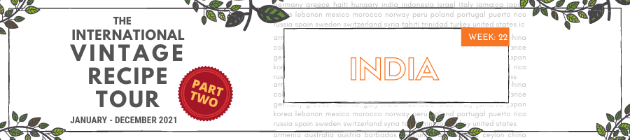 Today we are embarking on Week 22 of the International Vintage Recipe Tour which takes us to India via the kitchen to discuss fabric, second chances, and a savory chicken dish that is slathered in spice. Welcome to Week 22 of the Tour! Welcome to India…