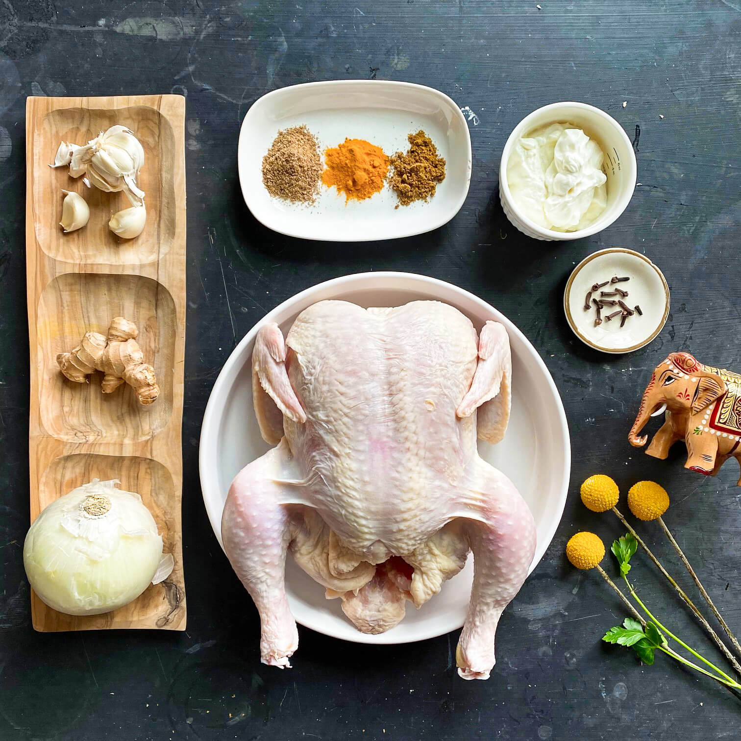 On the menu tonight it’s Chicken Bengal, a warm and saucy stewed chicken featuring five distinct spices – coriander, cumin, cloves, ginger, and turmeric. But before any of those flavors are introduced, the chicken marinates in a yogurt and garlic bath in the fridge for a few hours. After that point, the whole marinade, yogurt and all, slips into a sizzling pan of spices where it cooks for some additional hours over a low simmer until it reaches the point of falling-of-the-bone tenderness.