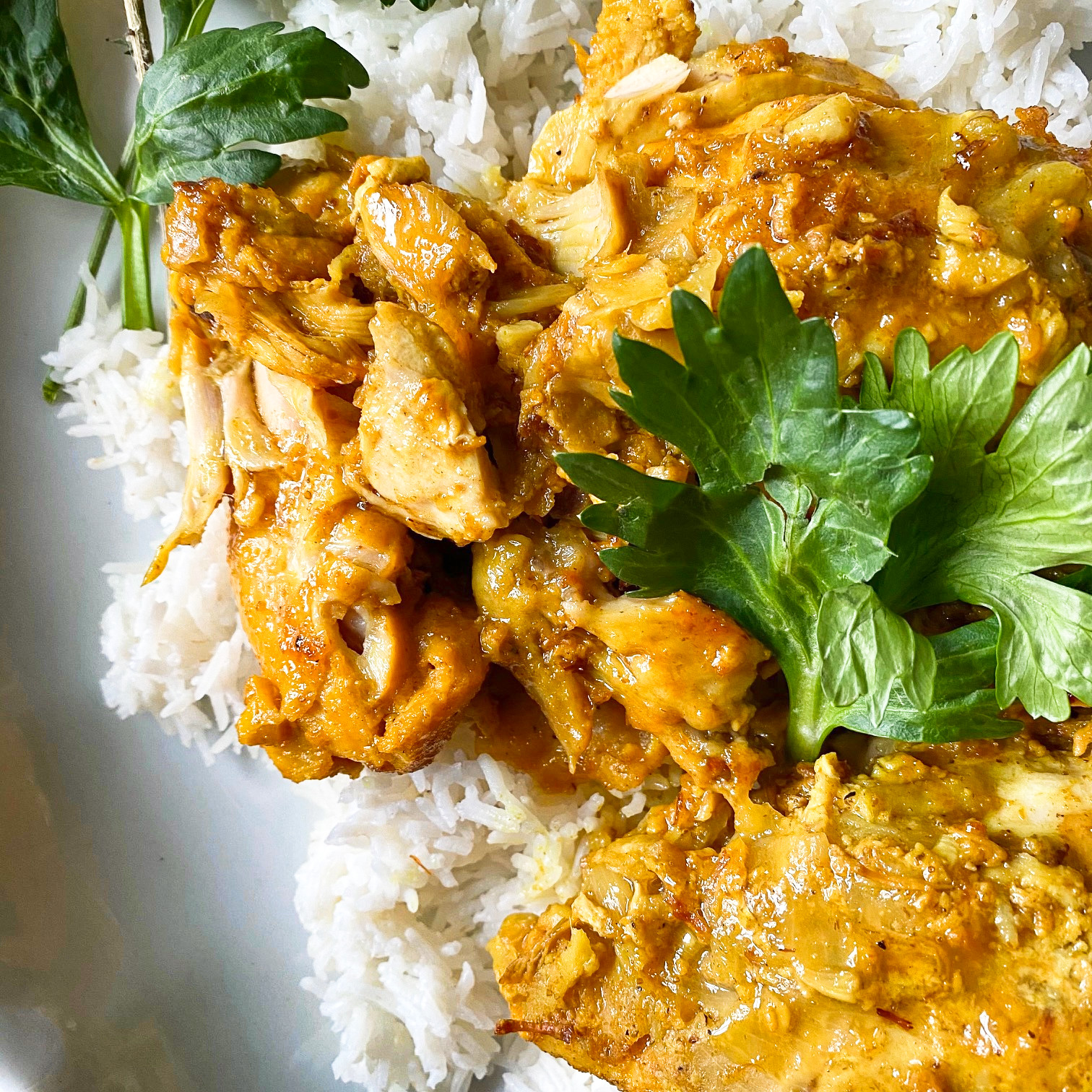 Cover and simmer until the chicken is fork-tender (approximately 2 hours). About thirty minutes before the chicken is done make the rice and set it aside, but keep it covered so that it stays warm. When the chicken is fork-tender and falling off the bone, remove it from the heat and let it rest for several minutes before serving it atop a bed of rice along with whatever juices are leftover in the pan.