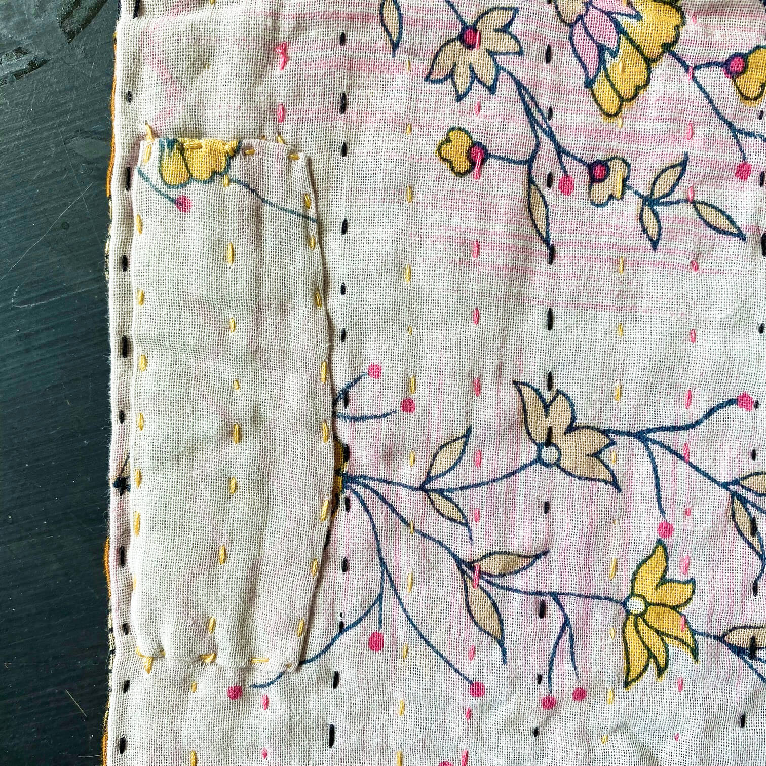 This type of fabric work utilizing recycled saris can be seen in all sorts of Indian handicrafts. Kantha is the type of stitch work featured in the Happy Scarf, which involves sewing together five layers of fabric and highlighting the running stitch that pieced them all together by using brightly colored thread. I first fell in love with this type of Indian textile art when my sister gave me this tote bag for my birthday a few years ago…