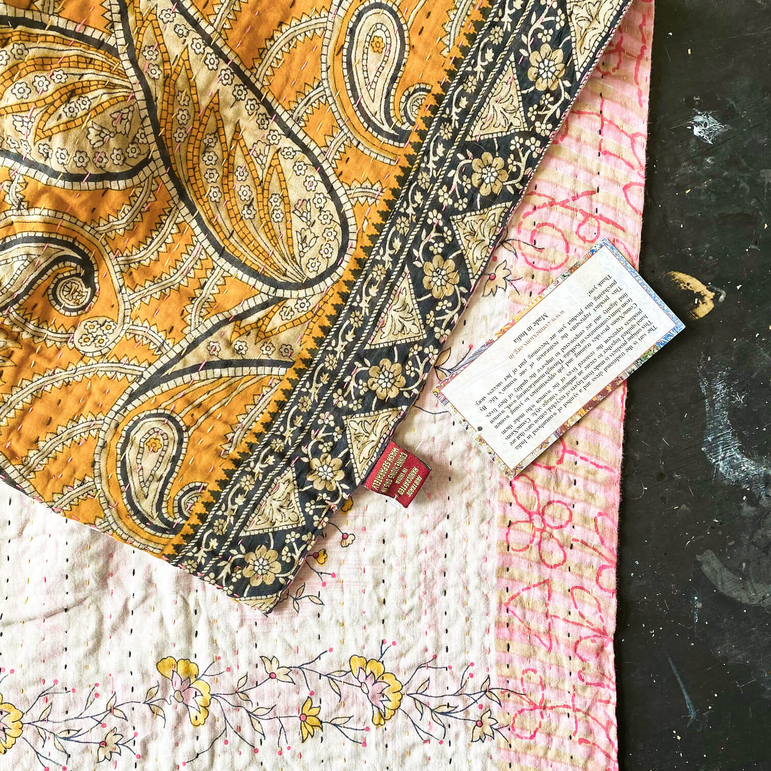 The visual beauty of each of these recycled sari creations, whether they are transformed into blankets or bags or table runners or napkins or, is that each one is one-of-a-kind. True works of art based on each sewer’s skill, fabric selection, and choice of color arrangement. The emotional beauty of these creations is that they helped improve one particular person’s life, one piece at a time.