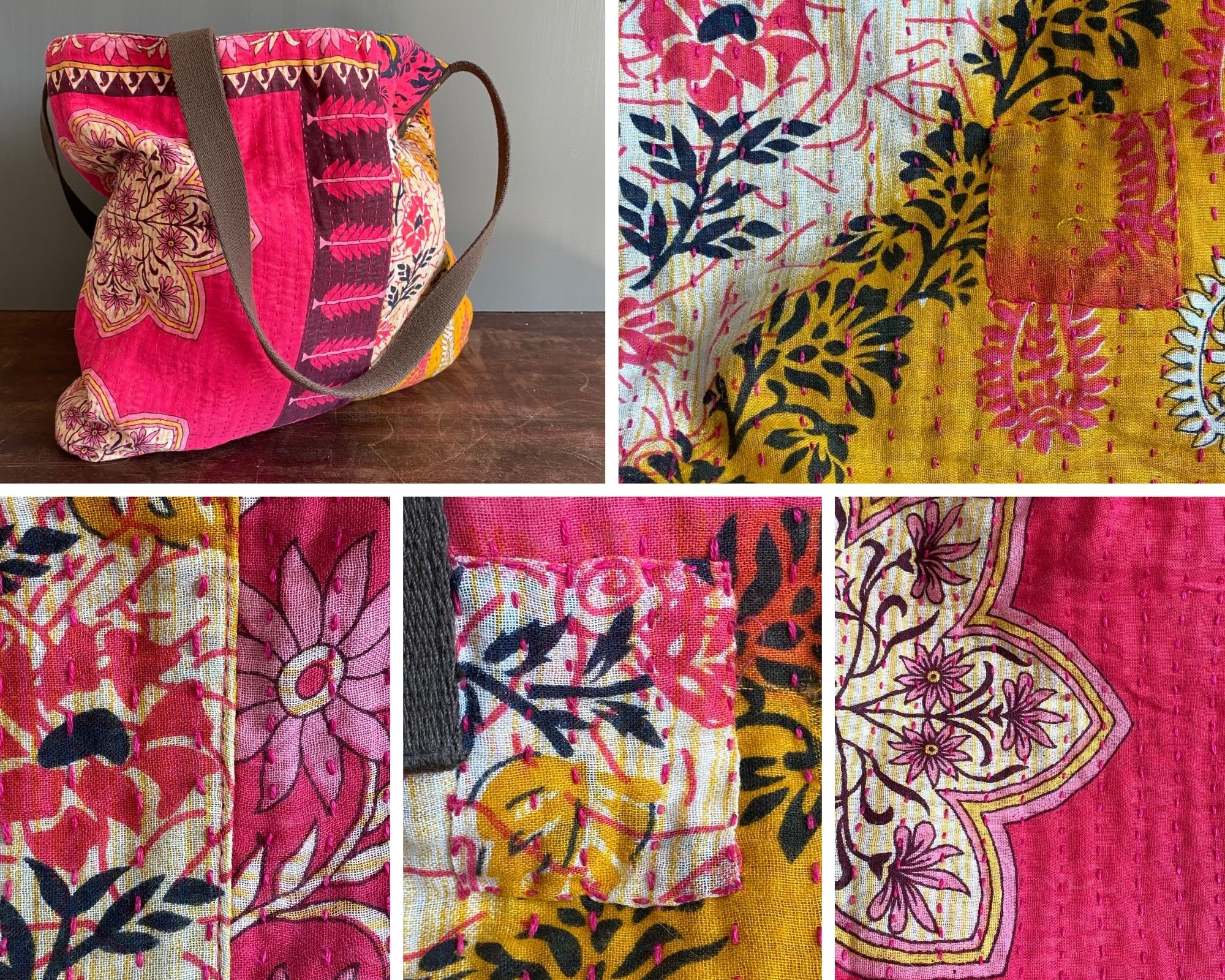 Like the Happy Scarf, my tote bag is made from five layers of two different saris, contains patchwork repairs and features lots of bright color. The front and the back both contain different imagery and the fabrics are super soft.
