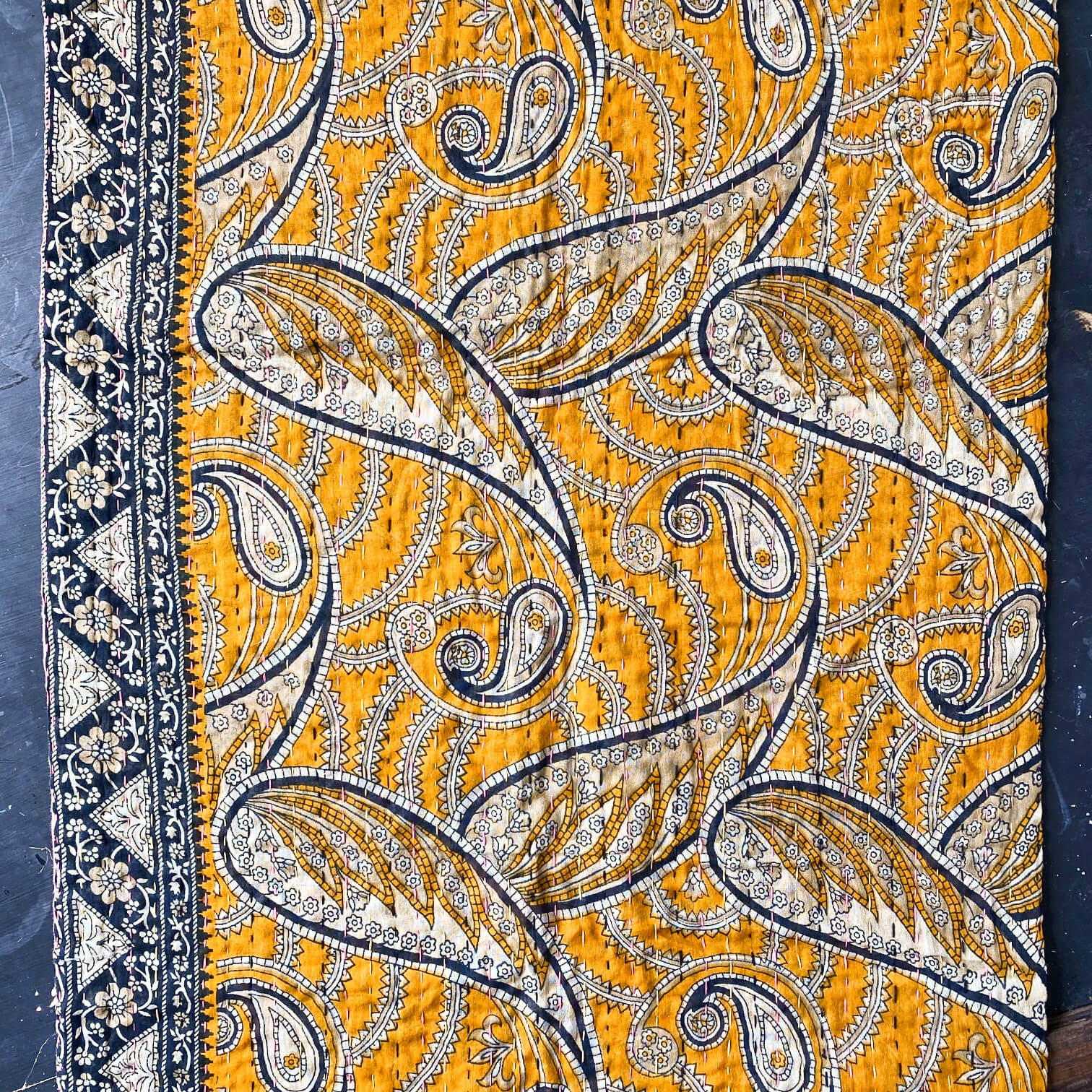 In the Hindu religion, to which 95% of India’s population belongs, the color yellow symbolizes learning and knowledge. That makes the Happy scarf an ideal companion for a table full of diners ready to engage in interesting conversation. Sized at 5′ feet in length x 15.75″ inches in width, it fits practically every table shape from long to short and is ready for a wide variety of styling fun. Here, I paired it with antique serving platters and flatware, vintage hotelware plates and midcentury napkins. The change in color palette from side to side adds a nice change in mood and aesthetic too…