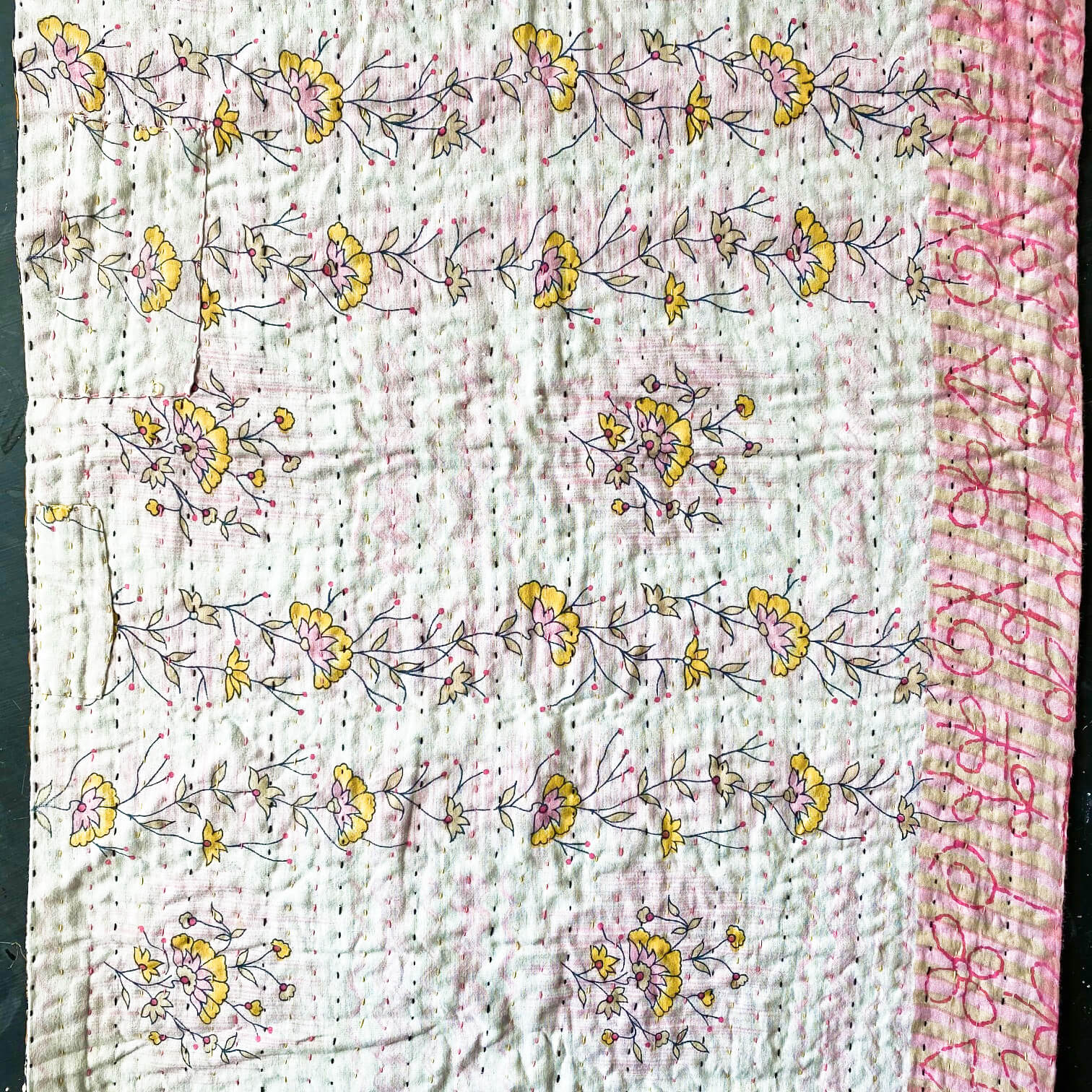 Tah-dah! It’s a five-foot-long Happy Scarf (ie table runner) made of two recycled cotton saris. Repaired, pieced together, and hand-quilted to form a completely new and functional item for the table, this type of Indian handicraft is changing the fate of women all over the country. Reversible, with a different pattern and color arrangement on each side, this Happy Scarf holds up to its name in more ways than one. Suitable for all four seasons of display and use, it features colors bright and sunny on both sides. One side contains shades of spring and summer in pink, yellow, peach, white and raspberry…