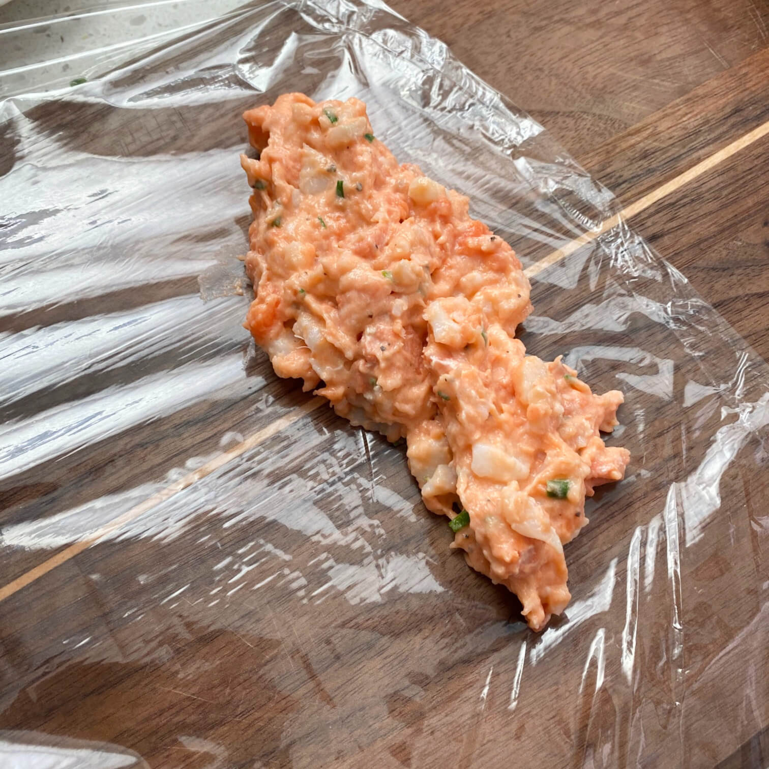 Remove fish mixture from fridge. Place one soup spoon size dollop of fish mixture onto a piece of plastic wrap and shape into a sausage.